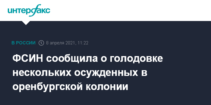 Москва. 8 апреля. INTERFAX.RU - В Оренбургской области в колонии строгого режима №9 несколько осужденных, помещенных в штрафной изолятор, отказались от пищи, сообщила пресс-служба регионального управления ФСИН.