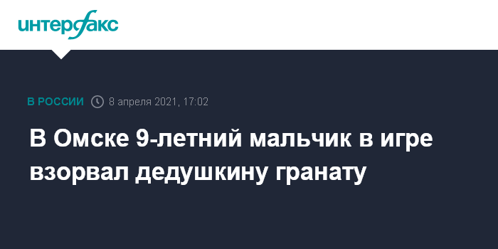 Москва. 8 апреля. INTERFAX.RU - В Омске идет доследственная проверка по факту взрыва учебной гранаты в руках у девятилетнего школьник, сообщили "Интерфаксу" в областном главке СК. По данным регионального издания "КП", ребенок пострадал, когда был в гостях у дедушки с бабушкой, а гранату его дедушка нашел и принес домой еще в 2008 году.