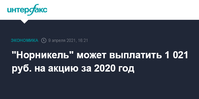 Москва. 9 апреля. INTERFAX.RU - Совет директоров ПАО "ГМК "Норильский никель" рекомендовал выплатить по результатам 2020 года 1 021,22 рубля (около $13,25 по курсу ЦБ на пятницу) на одну обыкновенную акцию, сообщила компания.