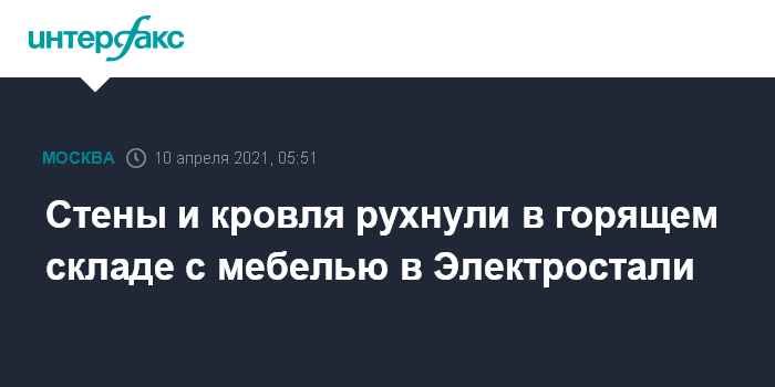 Москва. 10 апреля. INTERFAX.RU - Стены и кровля обрушились при пожаре на складе с мебелью в подмосковной Электростали, сообщили в субботу журналистам в пресс-службе МЧС РФ.