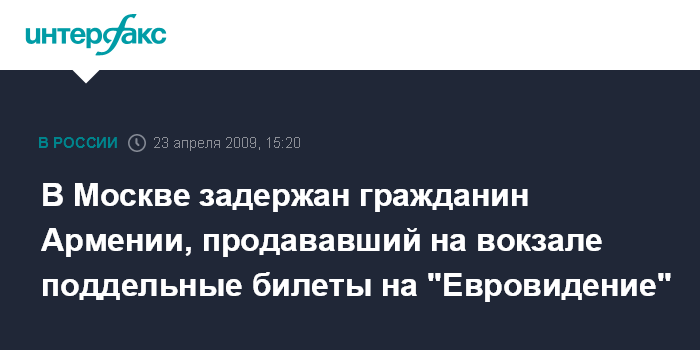 Москва. 23 апреля. INTERFAX.RU - На Казанском вокзале в Москве задержан уроженец Армении, который продал доверчивым гражданам поддельные билеты на международный конкурс "Евровидение-2009" и успел заработать на этом более 600 тыс. рублей.