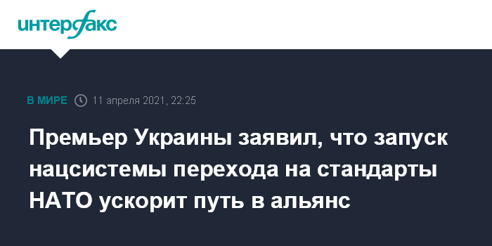 Москва. 11 апреля. INTERFAX.RU - Запуск национальной системы перехода на стандарты НАТО даст Украине возможность ускорить свой путь к полноправному членству в альянсе, заявил премьер-министр Украины Денис Шмыгаль.