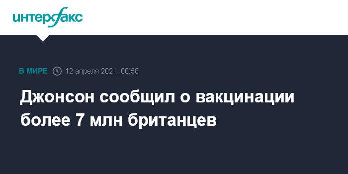 Москва. 12 апреля. INTERFAX.RU - Более 7 млн человек в Великобритании завершили процесс вакцинации от коронавируса COVID-19, заявил премьер Великобритании Борис Джонсон.