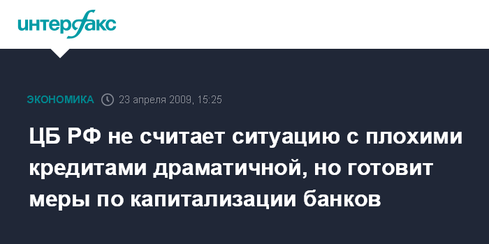 Москва. 23 апреля. INTERFAX.RU - ЦБ РФ не считает ситуацию с плохими кредитами драматичной, но на случай возникновения такой необходимости готовит меры по капитализации банков, заявил первый заместитель председателя ЦБ РФ Алексей Улюкаев в интервью агентству "Интерфакс-АФИ".