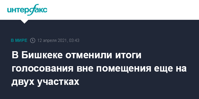 Москва. 12 апреля. INTERFAX.RU - Бишкекская территориальная избирательная комиссия (ТИК) отменила итоги голосования вне помещения еще на двух участках, сообщает в понедельник глава ТИК Кайрат Маматов.