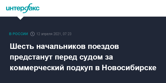 Москва. 12 апреля. INTERFAX.RU - Новосибирская транспортная прокуратура утвердила обвинительные заключения по шести уголовным делам в отношении начальников пассажирских поездов, обвиняемых в коммерческом подкупе, сообщает Западно-Сибирская транспортная прокуратура.