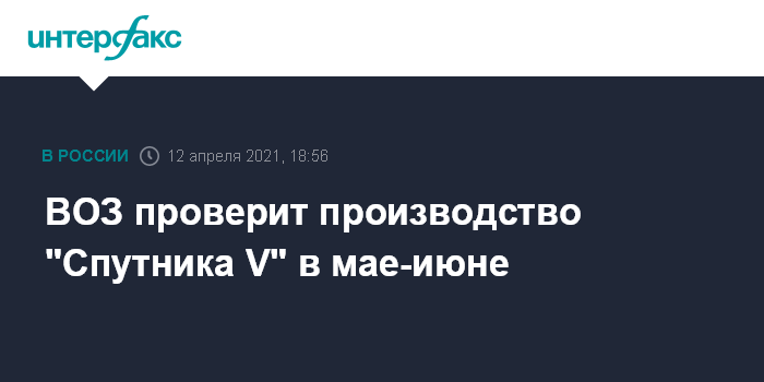 Москва. 12 апреля. INTERFAX.RU - Эксперты Всемирной организации здравоохранения проведут инспекцию производства вакцины "Спутник V" в мае и июне, следует из плана ВОЗ по оценке вакцин от коронавируса.