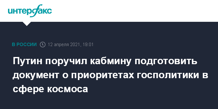 Москва. 12 апреля. INTERFAX.RU - Президент РФ Владимир Путин поручил правительству утвердить конкретные меры реализации приоритетов, заложенных в основах госполитики в области космической деятельности.