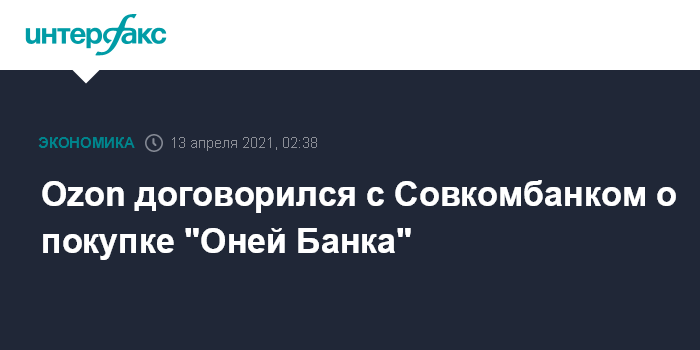Москва. 13 апреля. INTERFAX.RU - Ozon Holdings PLC подписал соглашение о покупке 100% ООО "Оней Банк" у Совкомбанка, сообщила во вторник компания.