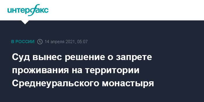 Москва. 14 апреля. INTERFAX.RU - Суд в Верхней Пышме (Свердловская область) вынес решение о запрете проживания граждан на территории Среднеуральского монастыря в связи с различными нарушениями, сообщает пресс-служба регионального ГУ ФССП.
