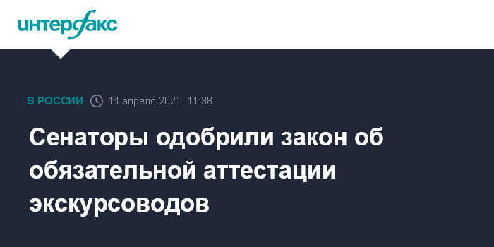 Москва. 14 апреля. INTERFAX.RU - Совет Федерации одобрил закон об обязательной периодической аттестации экскурсоводов и гидов-переводчиков и о запрете иностранцам заниматься этой работой. Законодательная инициатива вызвала протесты у части профессионального сообщества.