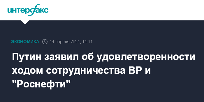 Москва. 14 апреля. INTERFAX.RU - Россия удовлетворена тем, как осуществляется сотрудничество британской BP Plc и "Роснефти", сообщил президент РФ Владимир Путин на заседании Русского географического общества.