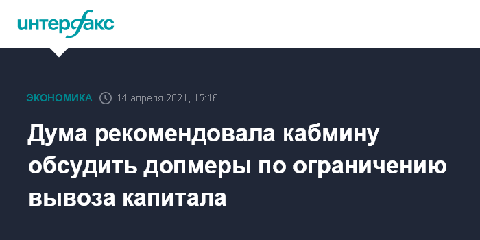 Москва. 14 апреля. INTERFAX.RU - Госдума рекомендует правительству обратить внимание на вывоз капитала из России и обсудить дополнительные меры, которые помогут избежать этого, следует из постановления, принятого на пленарном заседании в среду.