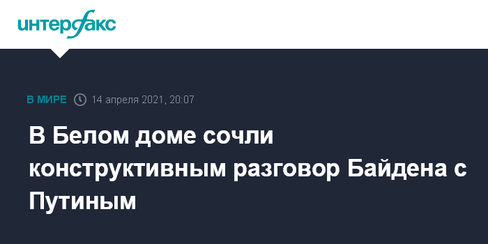 Москва. 14 апреля. INTERFAX.RU - Состоявшийся 13 апреля телефонный разговор президентов США и РФ Джо Байдена и Владимира Путина был конструктивным, заявила в среду представитель Белого дома Джен Псаки.