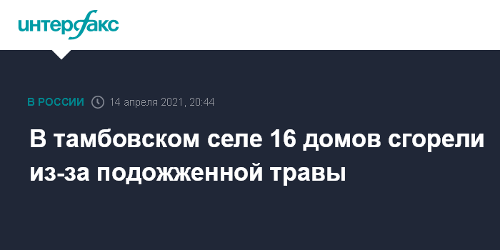 Москва. 14 апреля. INTERFAX.RU - Пожар уничтожил 16 домов в селе Троицкая Вихляйка Сосновского района Тамбовской области.