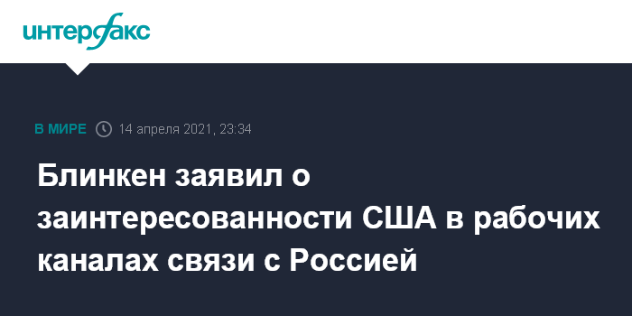 Москва. 14 апреля. INTERFAX.RU - Властям США нужны действенные каналы связей с Россией, чтобы наладить стабильные отношения, разъяснять собственную позицию по актуальным вопросам и критиковать некоторые инициативы Москвы, заявил глава Госдепартамента Энтони Блинкен.