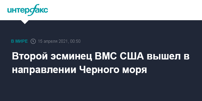 Москва. 14 апреля. INTERFAX.RU - Второй эсминец ВМС США - Roosevelt ("Рузвельт"), который должен зайти в Черное море, вышел из базы Суда-Бэй на греческом острове Крит и движется в направлении Черноморских проливов, следует из данных международной системы позиционирования судов (AIS).