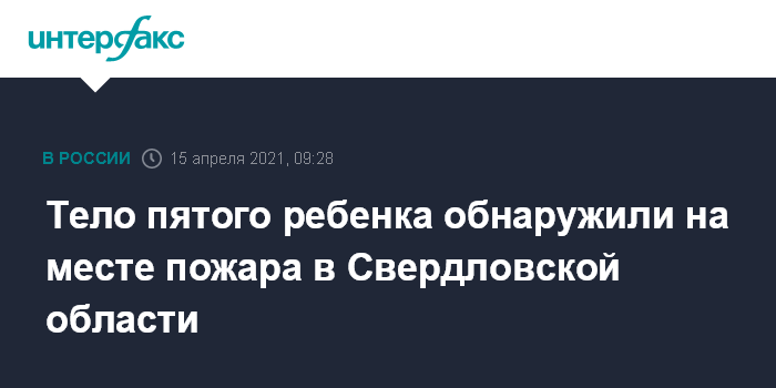 Москва. 15 апреля. INTERFAX.RU - Пятый ребенок, который ранее считался пропавшим, найден мертвым на месте пожара в частном жилом доме в селе Бызово в Свердловской области, сообщил "Интерфаксу" руководитель пресс-службы регионального ГУ МВД Валерий Горелых.