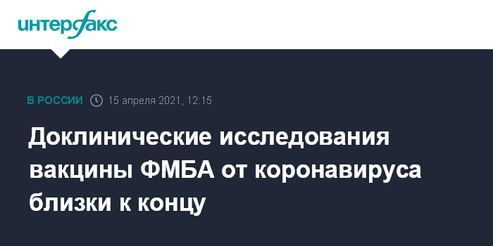 Москва. 15 апреля. INTERFAX.RU - Доклинические испытания вакцины от коронавируса Федерального медико-биологического агентства завершаются, заявила глава ФМБА Вероника Скворцова.