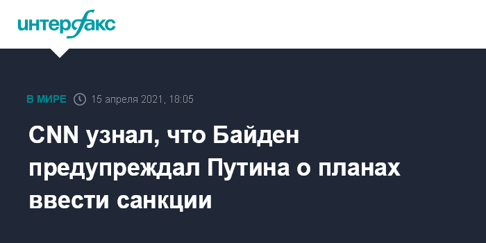 Москва. 15 апреля. INTERFAX.RU - Президент США Джо Байден в ходе недавнего телефонного разговора предупредил российского лидера Владимира Путина о неизбежности санкций, сообщает корреспондент телеканала CNN Кейтлан Коллинз со ссылкой на высокопоставленный источник в американской администрации.
