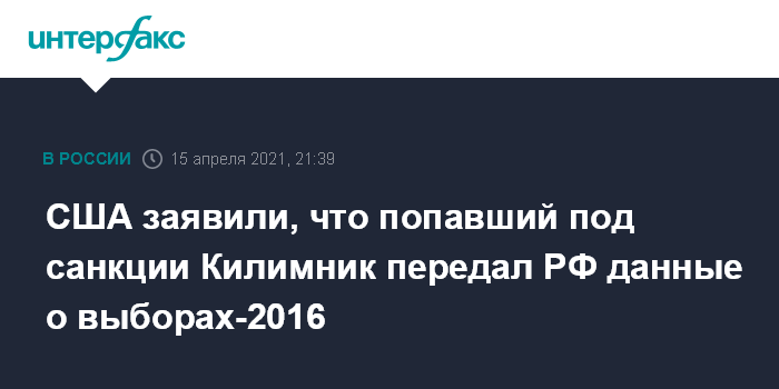 Москва. 15 апреля. INTERFAX.RU - Экс-партнер бывшего руководителя предвыборного штаба 45-го президента США Дональда Трампа Константин Килимник, подпавший в четверг под американские санкции, передавал российской разведке "чувствительную" информацию о президентской кампании в 2016 году, пояснил минфин США.