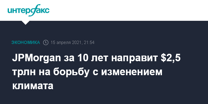 Москва. 15 апреля. INTERFAX.RU - Американский банк JPMorgan Chase & Co намерен выделить $2,5 трлн в ближайшее десятилетие на поддержку инициатив в сфере борьбы с изменением климата и обеспечения устойчивого развития.