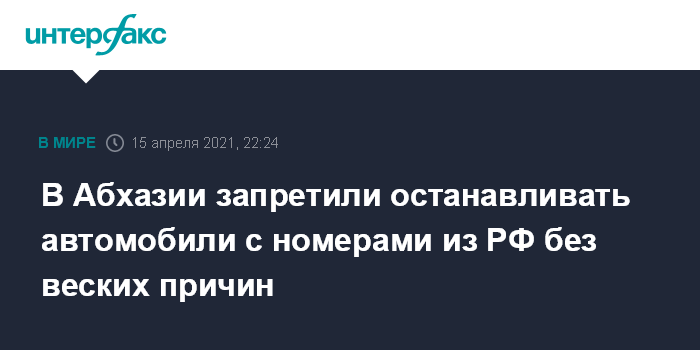 Москва. 15 апреля. INTERFAX.RU - В Абхазии сотрудникам ГАИ республики в период летнего туристического сезона запретили без веских причин останавливать автомобили с российскими номерами.
