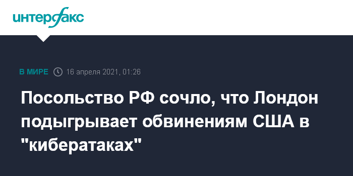 Москва. 16 апреля. INTERFAX.RU - Великобритания не предоставила никаких доказательств причастности Москвы к "вредоносной кибердеятельности" в отношении Вашингтона, заявили в четверг в посольстве РФ в Лондоне.