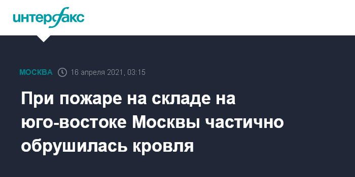 Москва. 16 апреля. INTERFAX.RU - При пожаре в складском помещении на юго-востоке столицы частично обрушилась кровля, сообщает в пятницу главное управление МЧС России по Москве.
