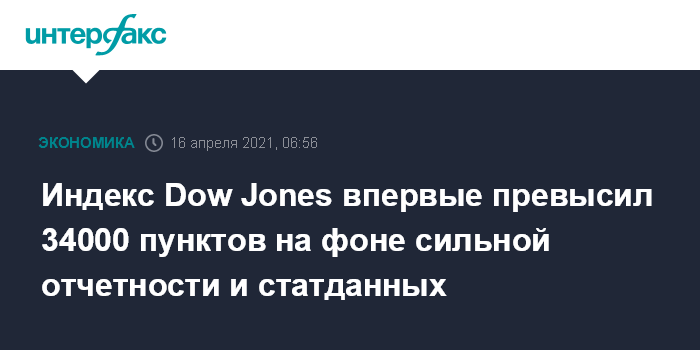 Индекс Dow Jones впервые превысил 34000 пунктов на фоне сильной отчетности и статданных