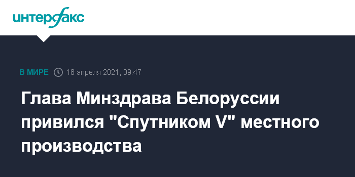 Москва. 16 апреля. INTERFAX.RU - Министр здравоохранения Белоруссии Дмитрий Пиневич привился первой российской вакциной от коронавируса "Спутник V", произведенной на белорусском предприятии "Белмедпрепараты", сообщается в телеграм-канале Минздрава в пятницу.