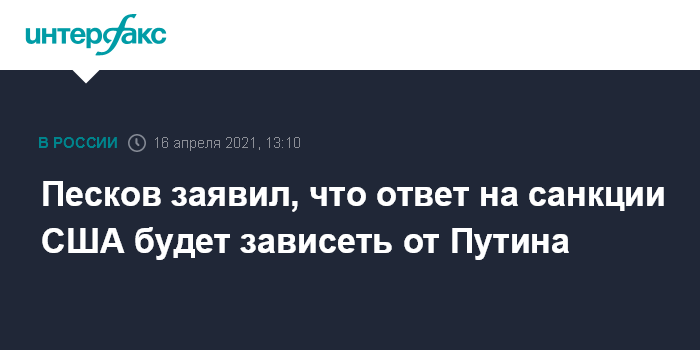 Москва. 16 апреля. INTERFAX.RU - Москва планирует ответить на новые санкции США по принципу взаимности, последнее слово - за президентом РФ Владимиром Путиным, сообщил пресс-секретарь главы государства Дмитрий Песков.