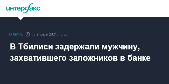 Москва. 16 апреля. INTERFAX.RU - Вооруженный грабитель, ворвавшийся в здание филиала "Банка Грузии" у станции метро "Авлабар" в Тбилиси, задержан.