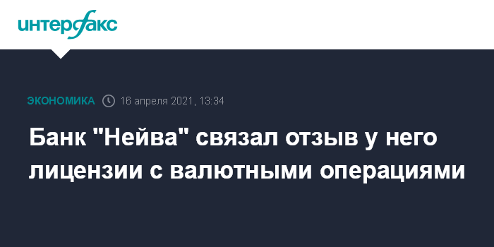 Москва. 16 апреля. INTERFAX.RU - Банк "Нейва" (Екатеринбург) считает причиной отзыва у него лицензии валютные операции.