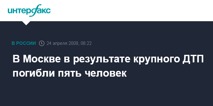 Москва. 24 апреля. ИНТЕРФАКС-МОСКВА - В Москве в результате крупного ДТП на пересечении Варшавского шоссе и Сумского проезда погибли пять человек.