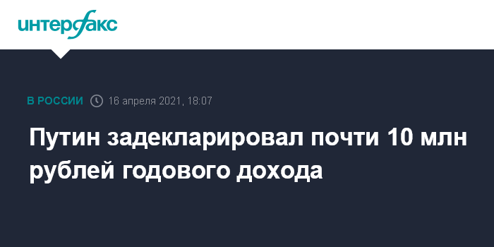 Москва. 16 апреля. INTERFAX.RU - Президент Владимир Путин в 2020 году получил 9 994 692 рубля дохода, говорится в его декларации о доходах и имуществе. Она опубликована на сайте Кремля. В 2019 году доход главы государства составил 9,726 млн рублей, в 2018 году - 8,6 млн рублей.