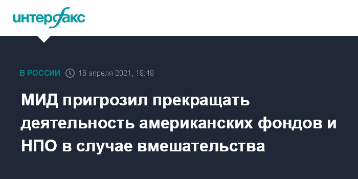 Москва. 16 апреля. INTERFAX.RU - Россия будет прекращать деятельность на своей территории американских фондов и НПО, которые "на деле, не скрывая, напрямую" вмешиваются во внутриполитическую жизнь страны, объявил министр иностранных дел Сергей Лавров.