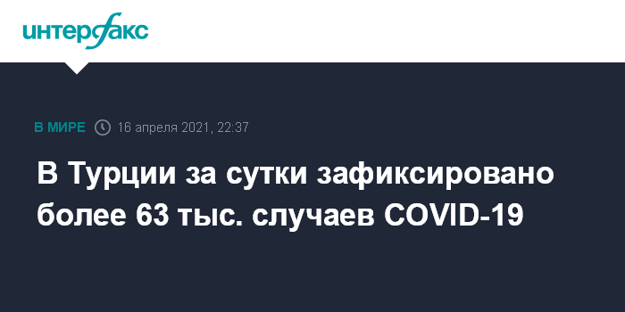 Москва. 16 апреля. INTERFAX.RU - В Турции за прошедшие сутки коронавирус COVID-19 выявили у 63 тыс. человек, 289 пациентов умерли от последствий заражения инфекцией, сообщает агентство Anadolu.