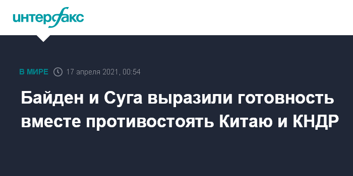 Москва. 17 апреля. INTERFAX.RU - США и Япония готовы вместе принять вызовы, исходящие от КНР и Северной Кореи, заявил президент США Джо Байден на совместной пресс-конференции с японским премьером Есихидэ Сугой.