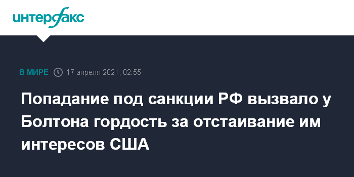 Москва. 17 апреля. INTERFAX.RU - Бывший советник президента США по нацбезопасности Джон Болтон посчитал попадание в российский санкционный список поводом для гордости за то, что он отстаивал интересы Соединенных Штатов.