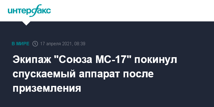 Москва. 17 апреля. INTERFAX.RU - Российские космонавты Сергей Рыжиков, Сергей Кудь-Сверчков и астронавт NASA Кэтлин Рубинс, вернувшиеся на Землю с Международной космической станции (МКС), покинули спускаемый аппарат корабля "Союз МС-17", следует из трансляции "Роскосмоса".