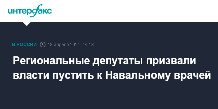 Москва. 18 апреля. INTERFAX.RU - Несколько депутатов законодательных собраний России обратились к президенту России Владимиру Путину, заявив о необходимости допуска врачей и оказания срочной медицинской помощи оппозиционеру Алексею Навальному, который находится в колонии во Владимирской области.