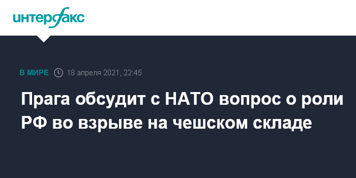 Москва. 18 апреля. INTERFAX.RU - Прага попросит Североатлантический совет рассмотреть вопрос о предполагаемой роли России во взрыве на чешском складе боеприпасов в 2014 году, сообщает европейское издание Politico со ссылкой на постпреда Чехии при НАТО Якуба Ландовского.
