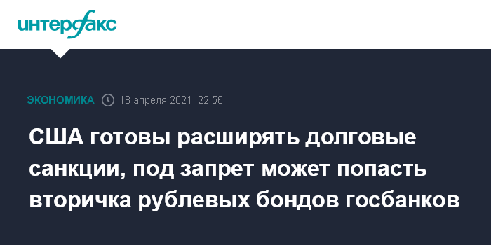 15 апреля Минфин США объявил о санкциях в отношении российского государственного долга: после 14 июня американские финансовые институты не смогут принимать участие в первичных размещениях госдолга РФ, номинированного в рублях.