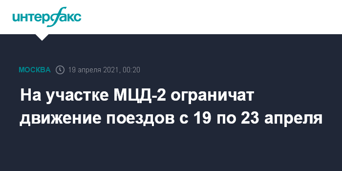 Москва. 19 апреля. INTERFAX.RU - Движение поездов на участке второй линии Московских центральных диаметров (МЦД-2) между станциями "Каланчевская" и "Курский вокзал" ограничат в дневное время с 19 по 23 апреля, сообщили в пресс-службе Московской железной дороги (МЖД).