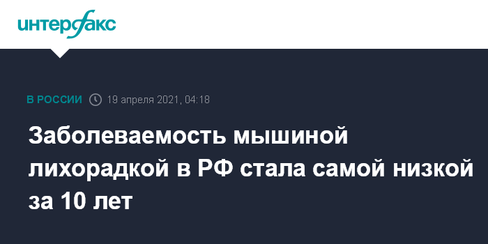Москва. 19 апреля. INTERFAX.RU - Показатель заболеваемости геморрагической лихорадкой с почечным синдромом (ГЛПС) в России в 2020 году стал самым низким за последние 10 лет из-за пандемии коронавируса, сообщается в понедельник на сайте Роспотребнадзора.