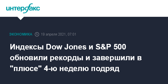 Москва. 19 апреля. INTERFAX.RU - Фондовый рынок США вырос по итогам торгов в пятницу, при этом индексы Dow Jones и S&P 500 обновили рекордные максимумы второй день подряд.