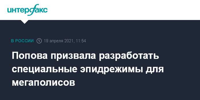 Москва. 19 апреля. INTERFAX.RU - Ситуация с заболеваемостью COVID-19 в крупных городах развивается по собственному сценарию, чем в целом по стране, поэтому для мегаполисов необходимы специальные эпидемиологические режимы, заявила в понедельник глава Роспотребнадзора Анна Попова.