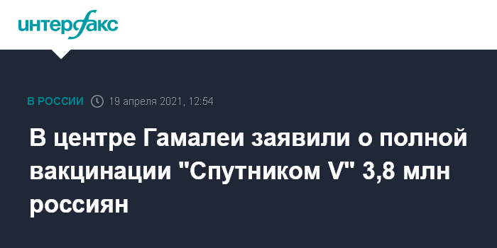 Москва. 19 апреля. INTERFAX.RU - Две дозы вакцины от COVID-19 "Спутник V" получили 3,8 млн жителей России, заявил на общем собрании отделения медицинских наук Российской академии наук замдиректора центра имени Гамалеи по научной работе Денис Логунов. Он сослался на базу вакцинации.