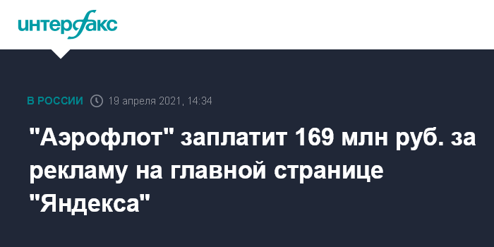 Москва. 19 апреля. INTERFAX.RU - "Аэрофлот" заплатит до 168,6 млн рублей за размещение рекламных баннеров на главной странице "Яндекса", следует из материалов сайта госзакупок.
